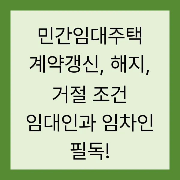 민간임대주택 계약! 어렵게만 느껴졌던 계약 갱신, 해지, 거절 조건, 이제 완벽하게 이해되셨나요? 꼼꼼하게 확인하고, 현명하게 대처해서 분쟁 없이 쾌적한 주거 생활을 누리시길 바랍니다! 기억하세요! 모든 궁금증은 주택도시보증공사(HUG) 또는 한국토지주택공사(LH) 에 문의하면 친절하게 답변해 드립니다. 내 집 마련의 꿈을 향해 나아가는 여러분을 응원합니다! 아자아자!